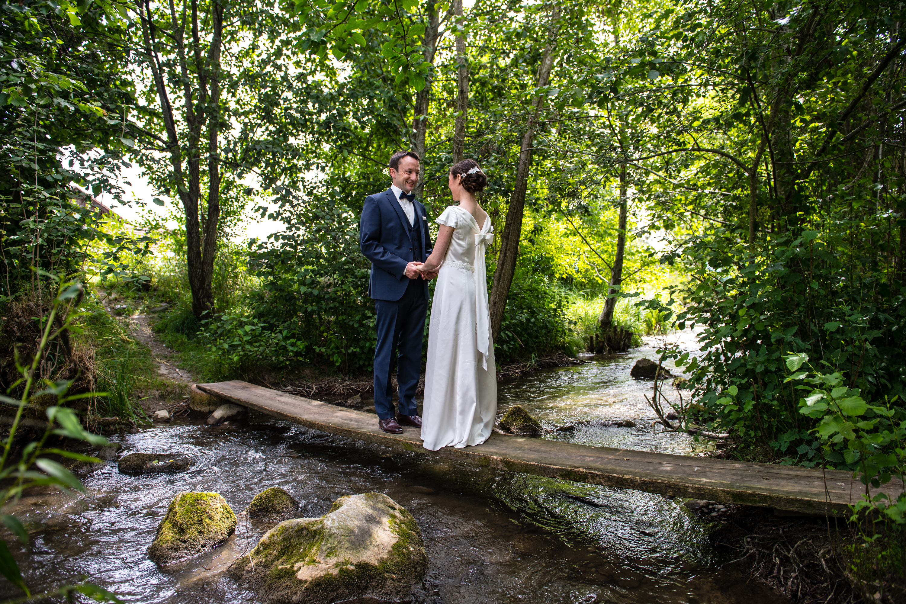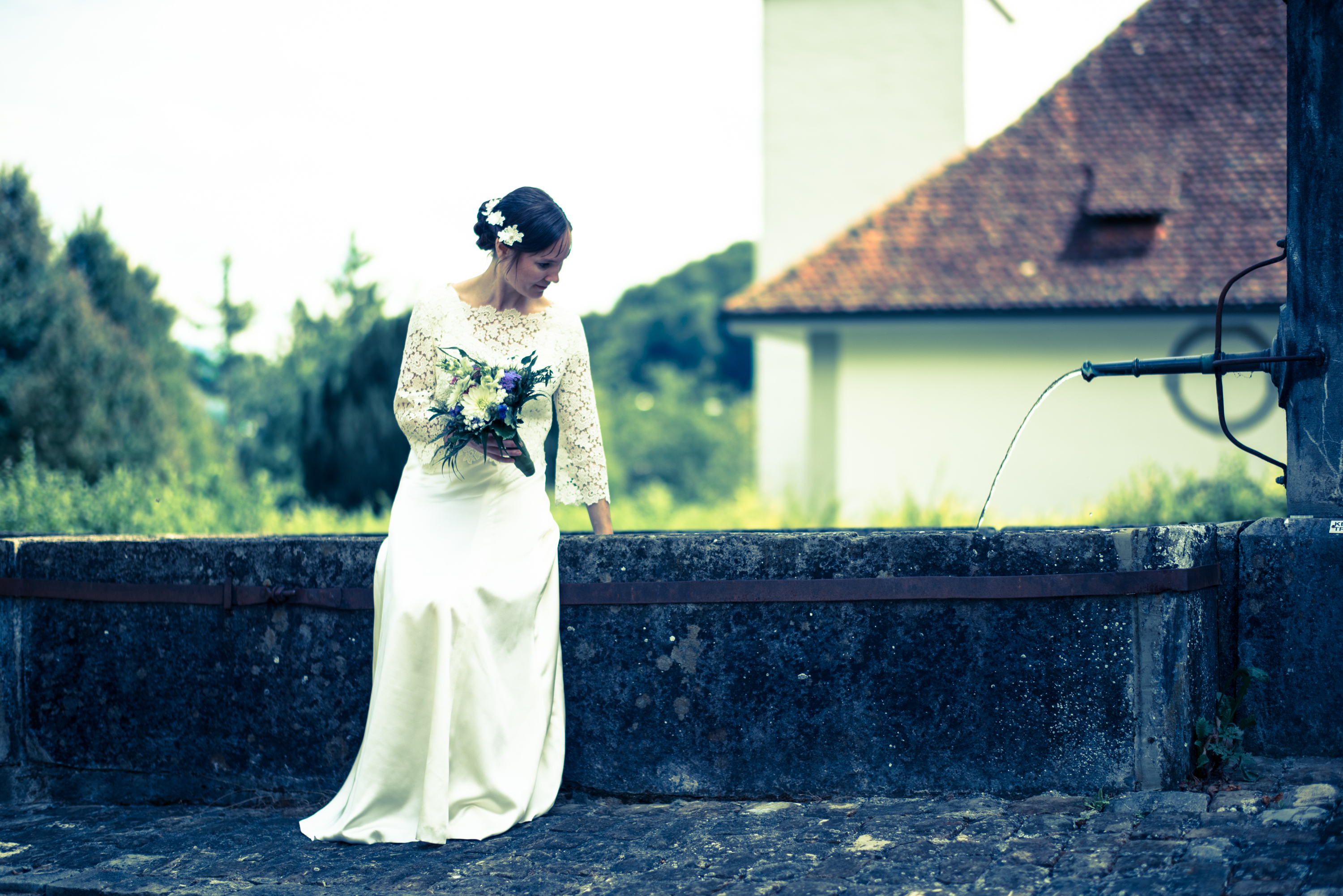 Brautkleid mit angeknöpftem Wasserfall. Verlaufend über die Schulter, ergibt im Rücken die Schleife.